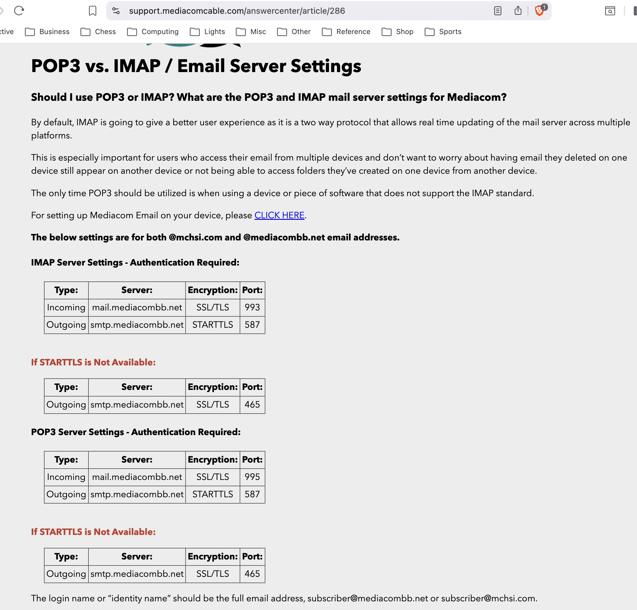- Check the new account. Does it look like my last screen image? Does it have all the IMAP server folders that it should have? Does it have the folders that you created on the server? If not, right click on the account name in the folder pane, select "Subscribe", and check all the folders. Expand the inbox in that list of folders to subscribe to if there are sub-folders of the inbox. Send a test message to yourself. Does it get sent? Received? Saved in the "Sent" folder? Are there connection issues? Do all the folders have the messages in them that they have on the server? If there are problems, check the settings that Thunderbird found against the settings that Mediacom says are needed (see attached image).