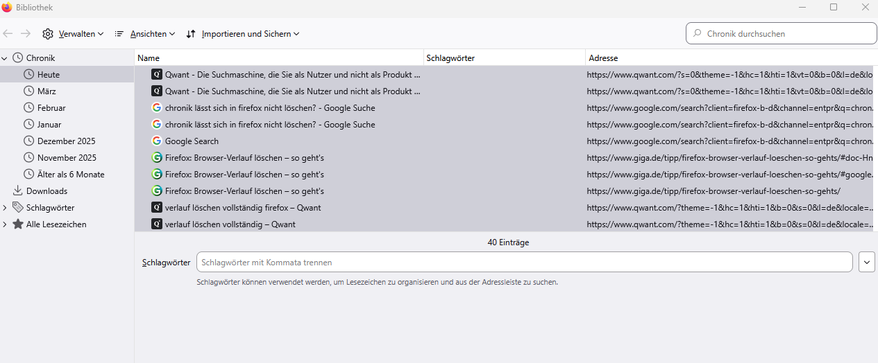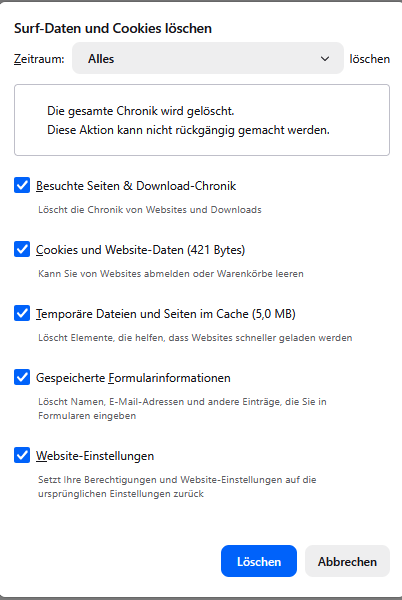Ich kann den Verlauf nicht löschen - alle Versuche lt. den Hilfethemen von Mozilla und auch anderen Foren habe ich ausprobiert - es passiert nichts wenn ich löschen anklicke.