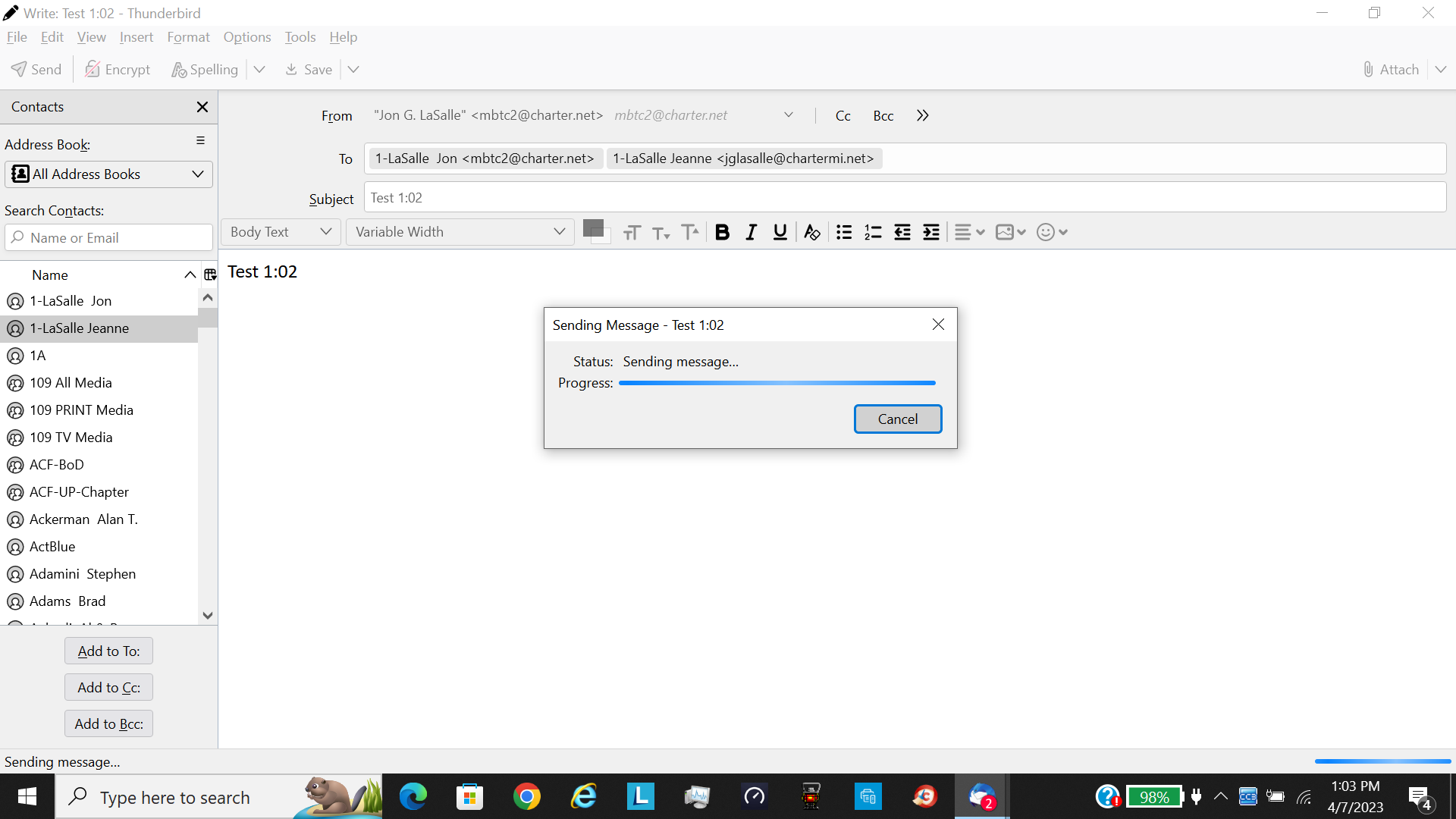 June 15, 2023 We are back in Michigan where my ISP is based. So, now Comcast is out of the network "loop". I have been using the Spectrum.net service to send emails when I need to. I thought making the change to get Comcast out of the network would bring back my ability to send emails from Thunderbird, but it did NOT. I still cannot use Thunderbird to send emails. When I try, the screen freezes with the send box but won't move the message out.