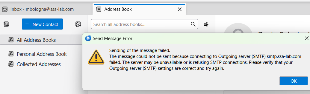 Unable to recieve emails. Status in the bottom left corner of the screen says "You are online", but when trying to refresh to receive emails, I get the message "Your connection has timed out".