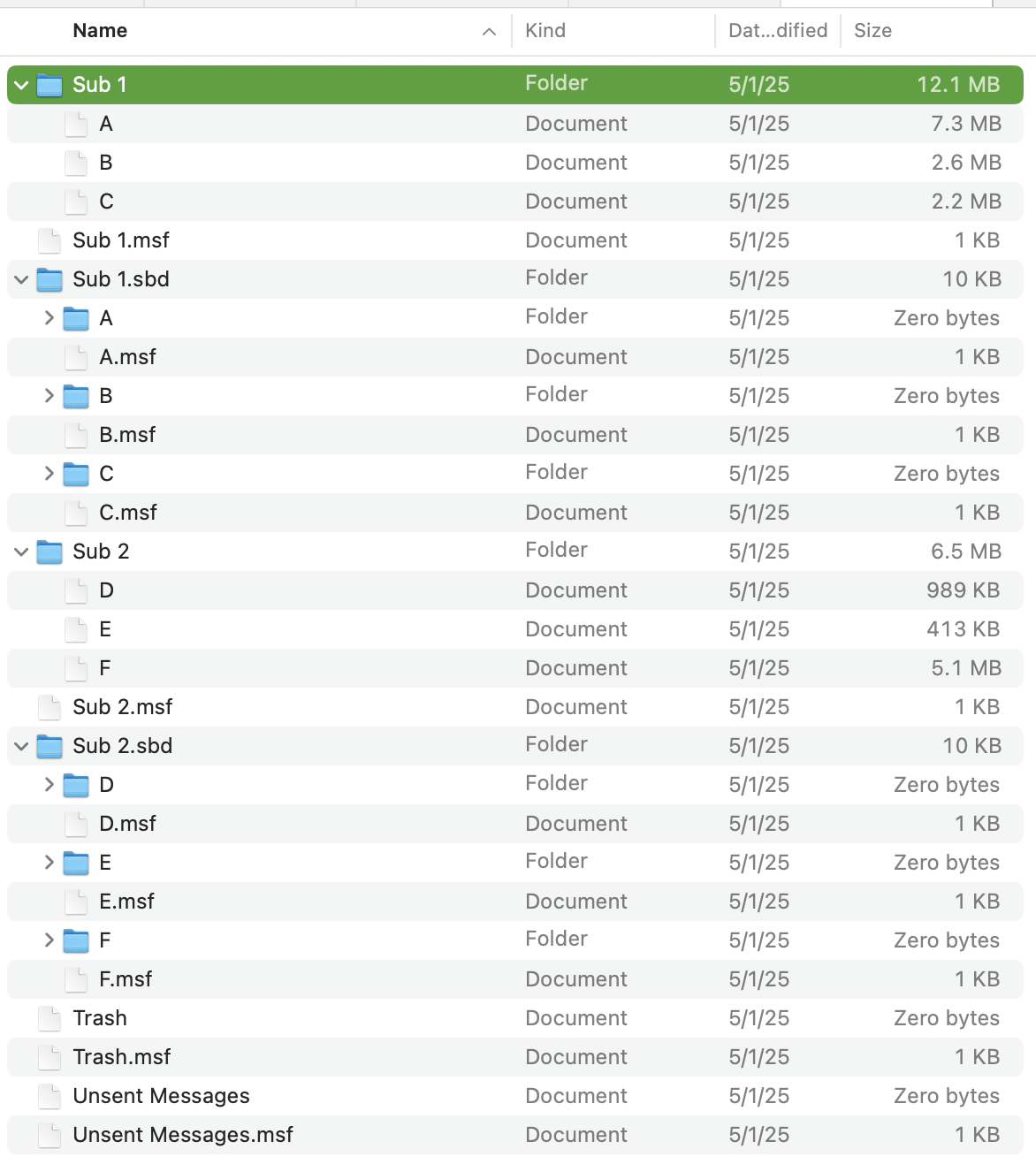I started with sub-folders that did not have an sbd extension. That was an oversight. I meant to reproduce Richard's situation with the sbd folders. Thunderbird created sub-folders with the sbd extension, but did not move the mbox files into them. Inside Thunderbird were empty folders. When I moved the mbox files myself into the sub-folders that Thunderbird had created in the file system, folders in Thunderbird remained empty.