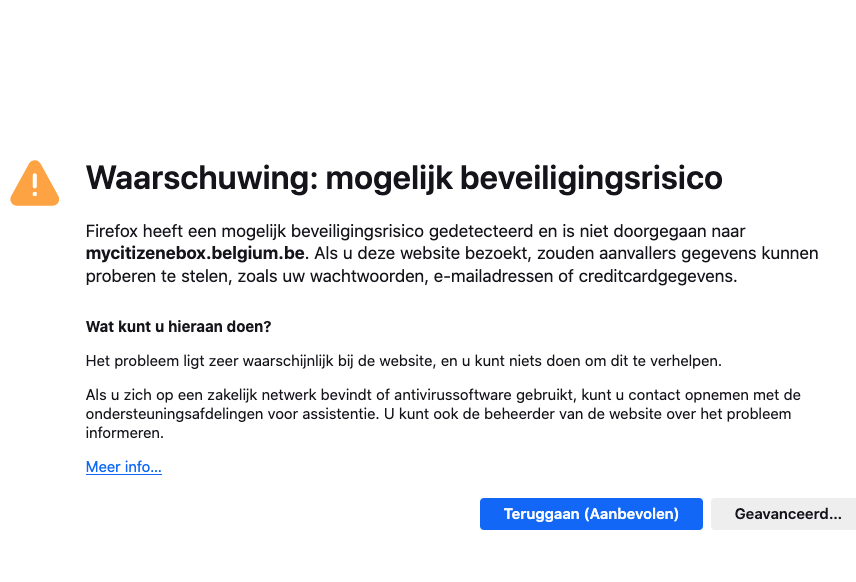 Ik kan reeds enkele weken niet meer inloggen op mijn ebox account. Krijg steeds veiligheidsmelding (zie screenshot in bijlage)