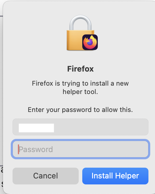 MacOS "Firefox is trying to install a new helper tool" dialog