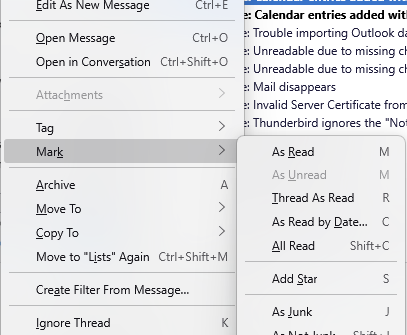 The keyboard shortcut to mark a message as read or mark it as unread is "M". On Windoze (11) the Ctrl key is supposed to be the keyboard shortcut activator, but when I type Ctrl+m (lowercase) a new message window pops up. If I use Ctrl+M (capital M) the message disappears. I'm not sure where it goes, I didn't see it in the Trash, however Ctrl+z (lowercase) restores the message to the message list. I searched Thunderbird settings to see how to modify or create keyboard shortcuts, but shortcut and keyboard gave zero results. How do I restore or set Ctrl+m to mark messages read/unread? (I did not modify any keyboard shortcut.)