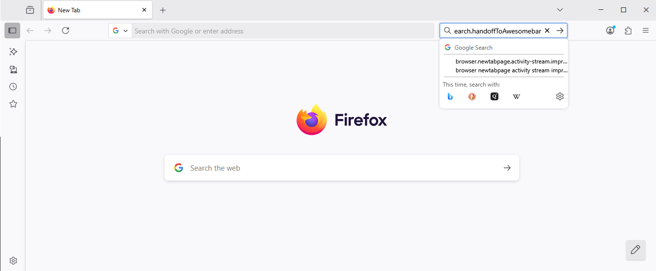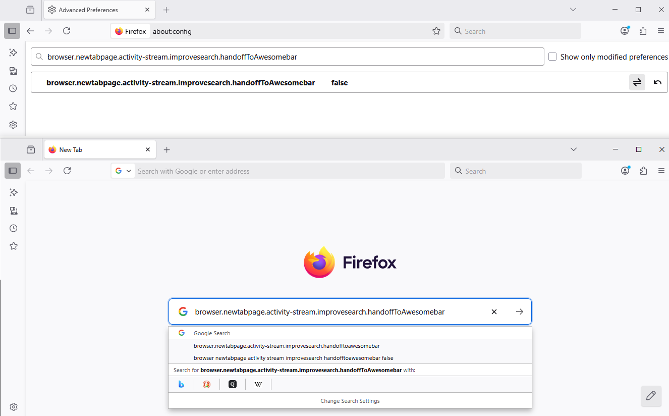 1 - Go to Configuration Editor for Firefox https://support.mozilla.org/en-US/kb/about-config-editor-firefox 2 - Enter a search term browser.newtabpage.activity-stream.improvesearch.handoffToAwesomebar You can double-click on the preference to set the value to false
