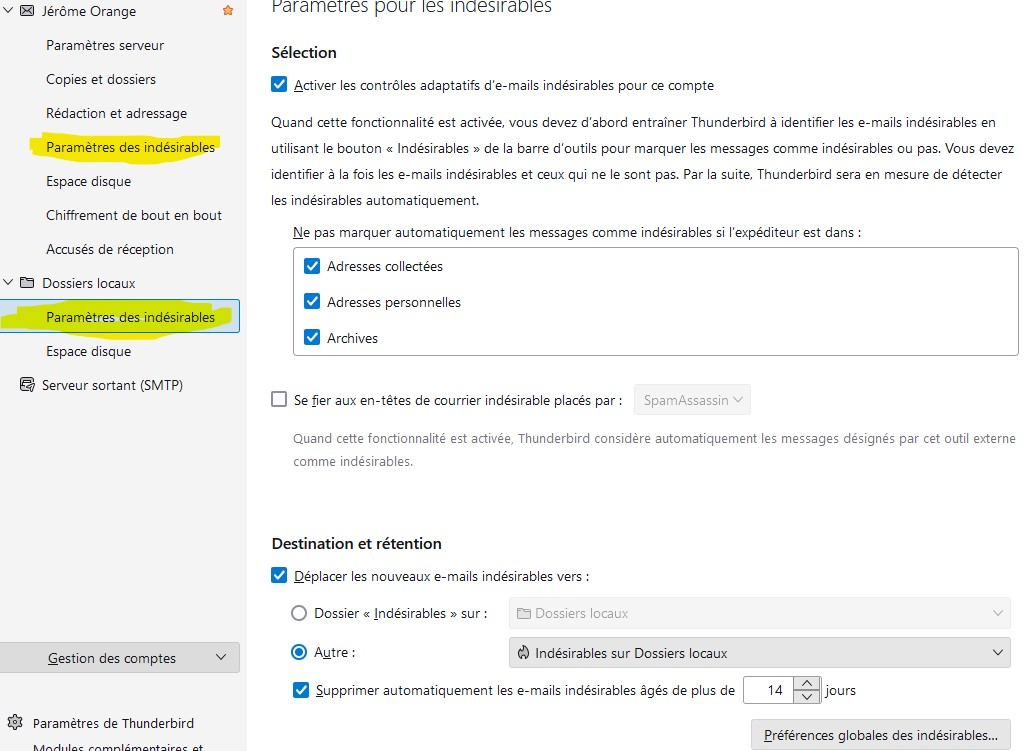 J'ai décoché et recoché la case "Activer les contrôles adaptatifs d’e-mails indésirables pour ce compte" dans les paramètres de compte. Cela semble fonctionner de nouveau. On trouve "Paramètres des indésirables" à deux endroits, j'ai mis les mêmes paramètres sur les 2. Jérôme.