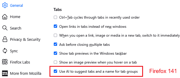 I am running 142.0 on Win11 Pro. In Settings/General/Tabs "Use AI to suggest tabs and a name for tab groups" is not shown. This suggests that user control has been removed.