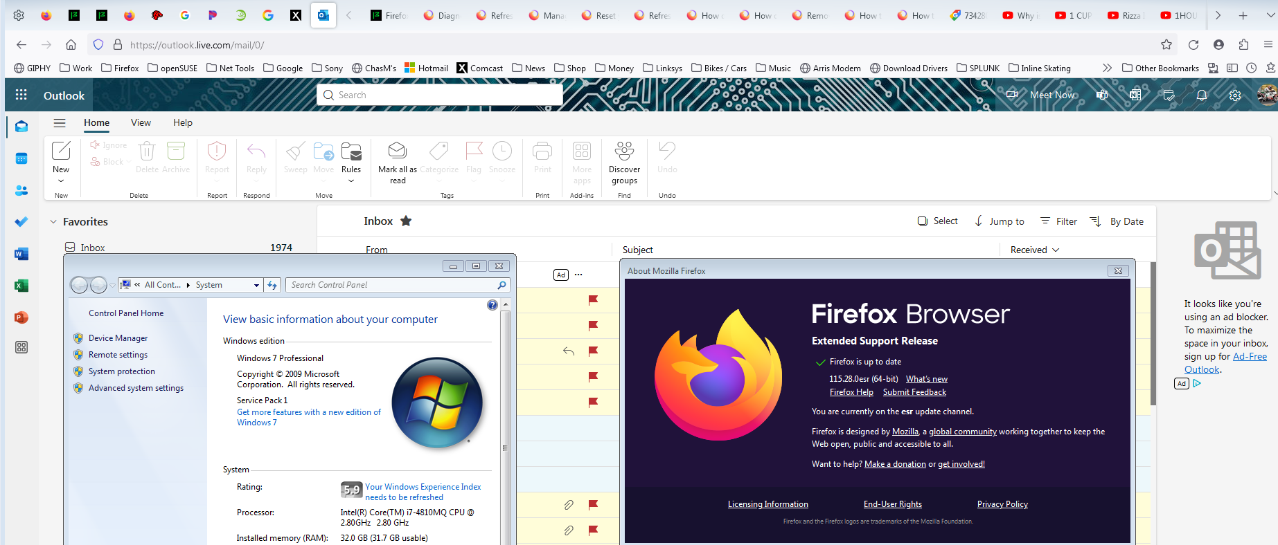 The login process for Hotmail has recently been improved and it's just 7 clicks for me and I'm in everyday. Have you tried with Firefox in Troubleshoot Mode? https://support.mozilla.org/en-US/kb/diagnose-firefox-issues-using-troubleshoot-mode#w_how-to-start-firefox-in-4troubleshoot-modesf5safe-modesf Are you running any security software? Sounds like it's time to upgrade. I do have win7, but rarely use it. Let me login and see what happens.