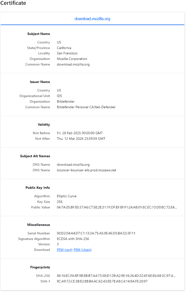 A lot of people use Bitdefender, so you probably are not alone in this situation. But when I searched on Bugzilla, I couldn't find an open bug. If Bitdefender doesn't have any workaround (i.e., ability to exclude download.mozilla.org from interception), you could file a new bug. https://bugzilla.mozilla.org/