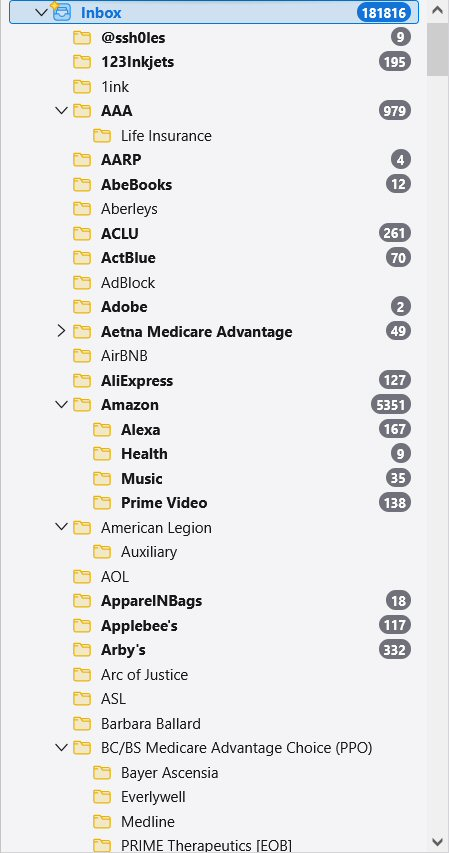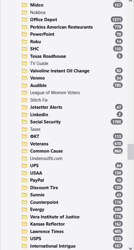 I've posted BOTH the bottom (first) and the top (second) of the folder pane of my primary email inbox.