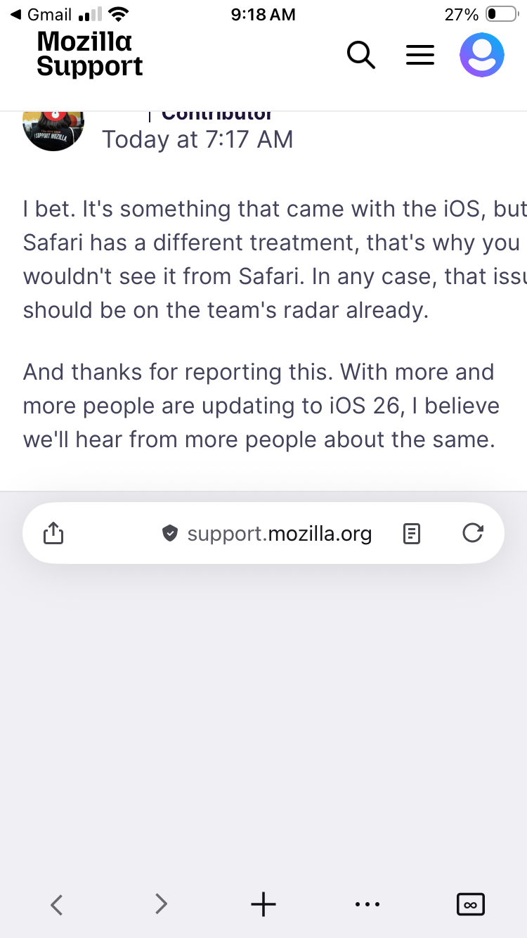 Firefox is near unusable after iOS 26 update. The UI is gigantic and obscures the browser window.