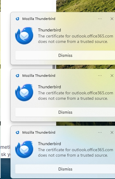 I have just installed Thunderbird, am continually getting "certificate for outlook.office365.com" not trusted