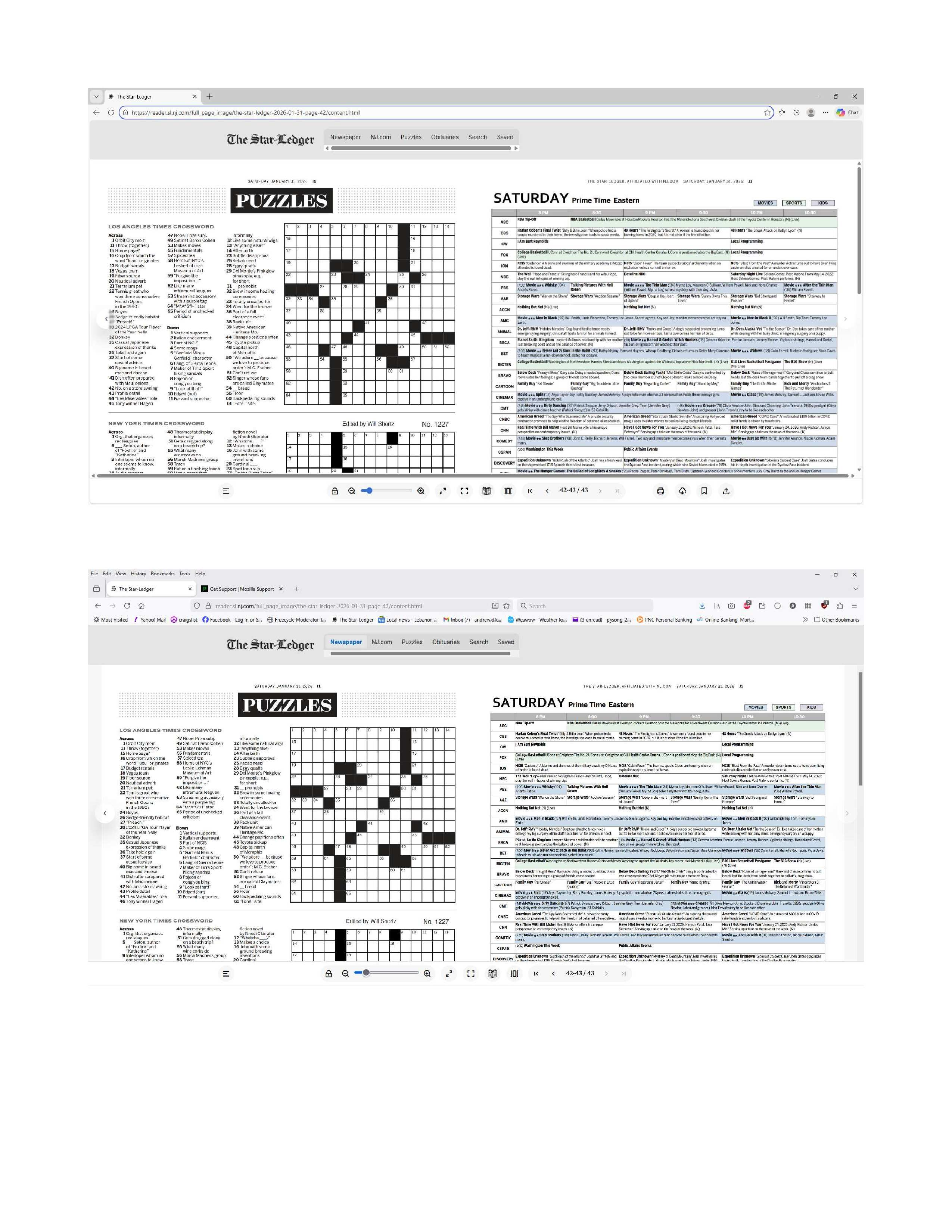 My local newspaper has gone only digital, which I actually like. But, there is an option on the bottom of the reader that is available when using Edge and is not available when I use Firefox. A mouseOver on Edge displays "Print or clip". Yes, it's a snipping tool and/or print option. But it really right-sizes the snipped area perfectly for printing crossword puzzles. The Windows snipping tool (Windows 11) makes it too small so I need to go to Edge for only this one task. My first preference would be to get the function on the Firefox screen, and my second choice would be to figure out how to use the Windows snipping tool to print without leaving Firefox. Firefox 147.0.1 (64-bit) The reader if your allowed to open it: https://reader.sl.nj.com/full_page_image/the-star-ledger-2026-01-31-page-42/content.html There are Edge and Firefox screenshots in the attached file. The icon(s) of which I speak is the first of the four on the bottom right of the Edge screenshot ( the first screenshot).