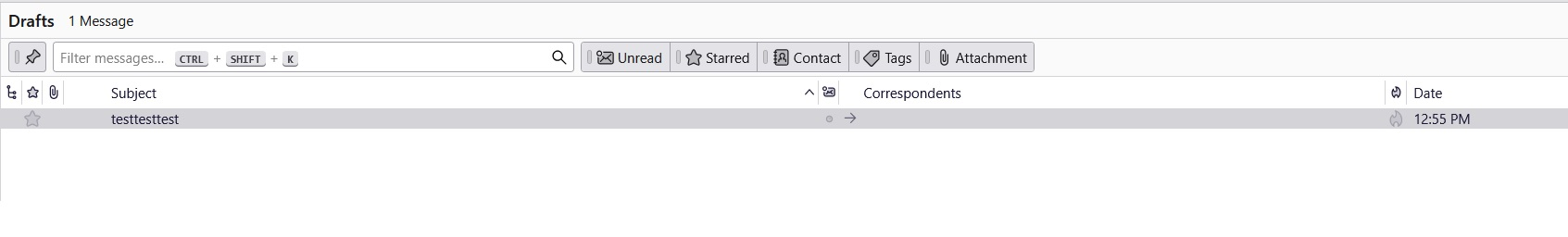 Draft messages composed in Thunderbird are not going to the Drafts folder. Draft messages composed in Gmail online are going to Drafts folder in Gmail online AND in Thunderbird. Screen shot enclosed. This is the test message created in Gmail online. As you can see it is the only thing in the folder. Everything else is gone.