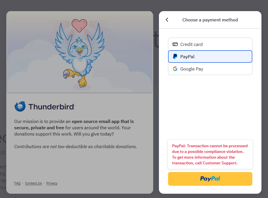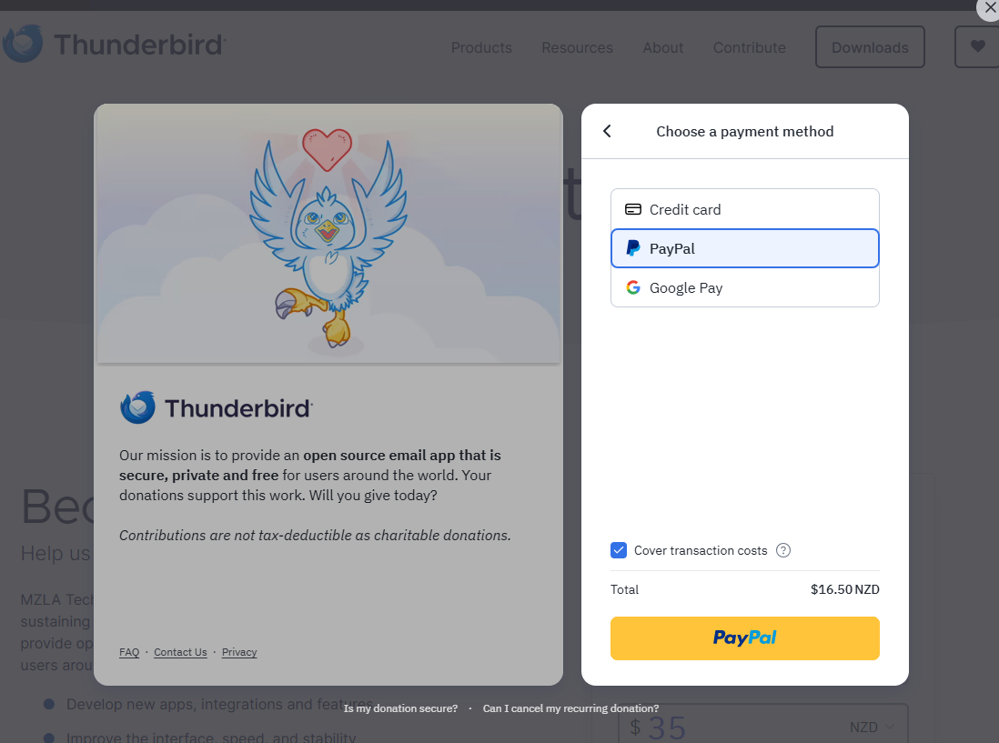 In the FAQ bellow on https://www.thunderbird.net/donate/ there is this https://www.thunderbird.net/donate/help/