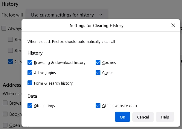 Or perhaps there are clear history add-ons with similar functionality? For example, I found this one that offers more categories: https://addons.mozilla.org/en-GB/firefox/addon/clear-browsing-data/