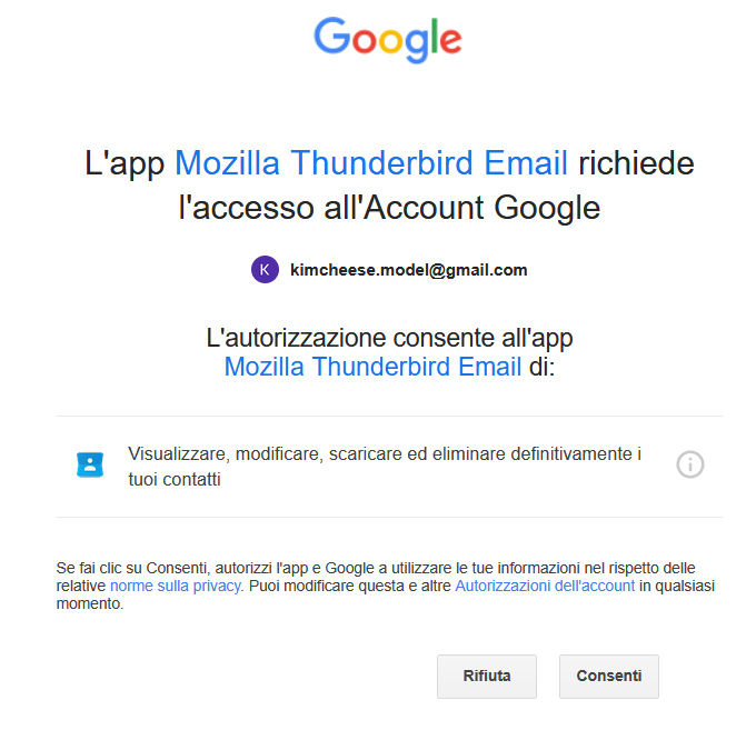 ho creato un account google, ho creato un account su thunderbird collegato all'account google poi ho cancellato l'account to thunderbird and successivamente anche su google nonostante questo continua a chiedermi l'autorizzazione su google di un account che ho già cancellato da settings-privacy & security ho anche cancellato la password relativo a quell'account ma ancora si presenta la finestra non so pi' cosa fare grazie