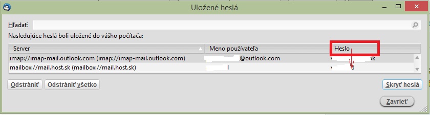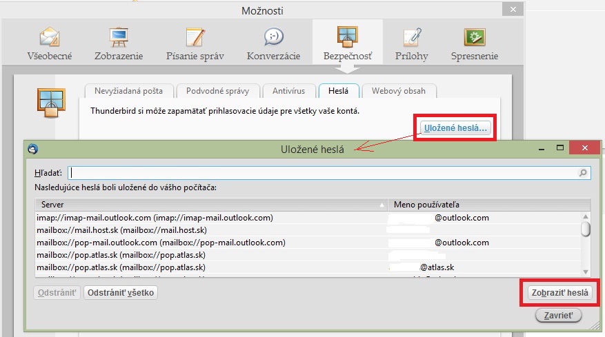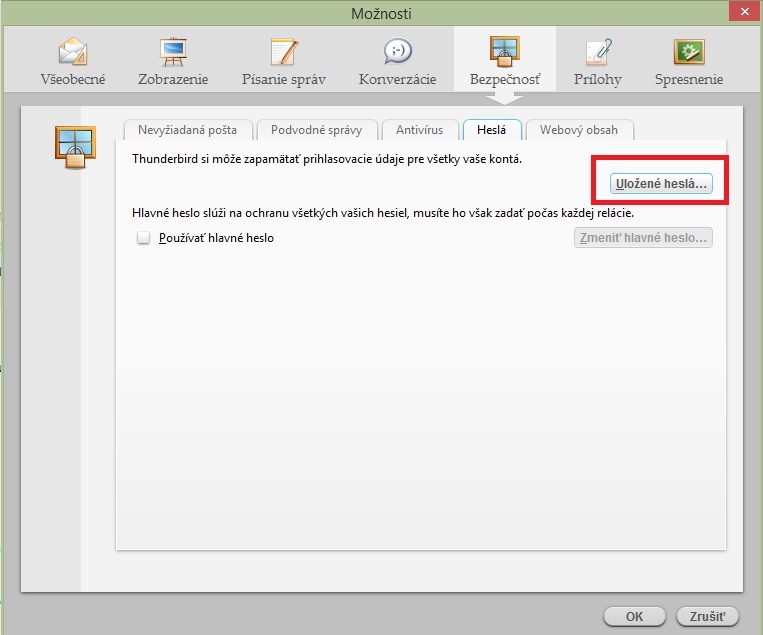 Thuderbird zabudnuté HLAVNÉ heslo k Thunderbirdu: Heslo pre softvérové zabezpečenie ste si museli sami nastaviť. Pokiaľ sa žiadosť stále zobrazuje, tak sa to dá rozchodiť RESETOVANÍM HESLA k Thunderbirdu. Resetovanie ale vymaže všetky uložené heslá v Thunderbirde. Je to preto, aby nedošlo k ľahkému získaniu ďalších hesiel neoprávnenou osobou. Pred týmto úkonom si vypíšte na papier všetky hesla z Thunderbirdu: http://imgbank.cz/images/2014/11/12/thunderbird_hesla.jpg a potom http://imgbank.cz/images/2014/11/12/thunderbird_hesla_zobrazit.jpg a potom http://imgbank.cz/images/2014/11/12/Thunderbird_hesla3.jpg a tu ich máš zapísané.