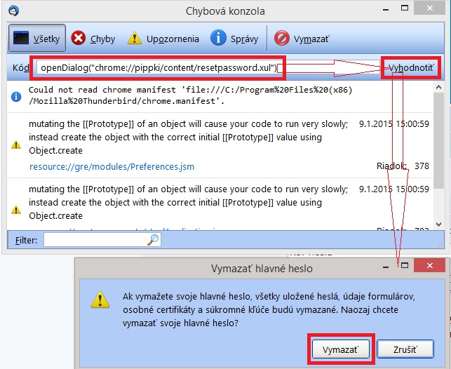 Resetovanie hesla vykonajte takto: Otvorte ponuku "Nástroje/Vývojárske nástroje/Chybová konzola" (alebo iba CTRL+SHIFT+J) a do políčka "Kód:" vložte následujúci kód: