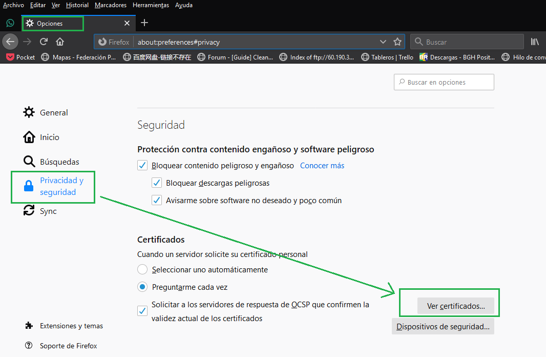 Hola, Entonces cuando ingresas a esas paginas el Firefox no solicita el certificado por lo tanto aparece el error, en hay en la solapa "decisiones de autentificación" del menú Certificados del Firefox? De existir alguna "decisiones" en esa solapa eliminalos y prueba nuevamente. Si el Firefox pregunta por el certificado cuando ingresas a la pagina No marques recordar el certificado. Saludos