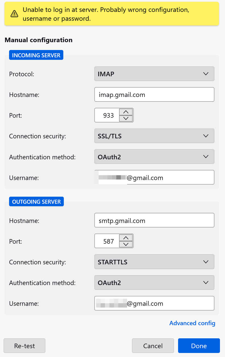 IMAP: imap.gmail.com IMAP port: 933 SSL/TLS Authentication method: OAuth2