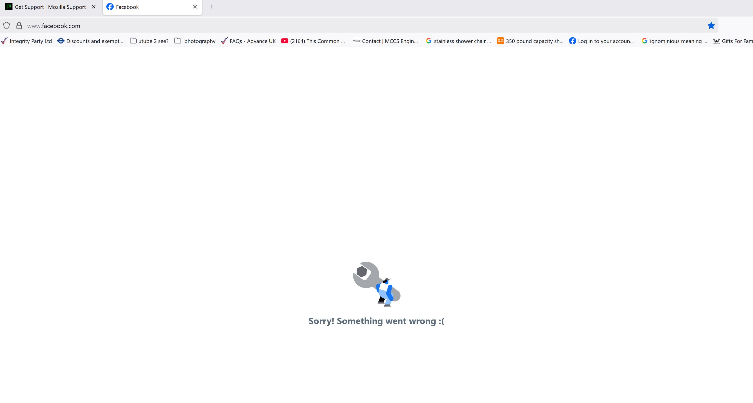 Facebook works on Google Chrome and Safari, but not Firefox. It opens, I can see reels, but the regular Facebook feed ends immediately with a "Something Went Wrong" tech error message. I turned my computer off and on, checked my password and logged in again, disabled ad blockers, removed hundreds of cookies, restarted, even upgraded to most recent Firefox to no avail. Please fix this. Thank you!