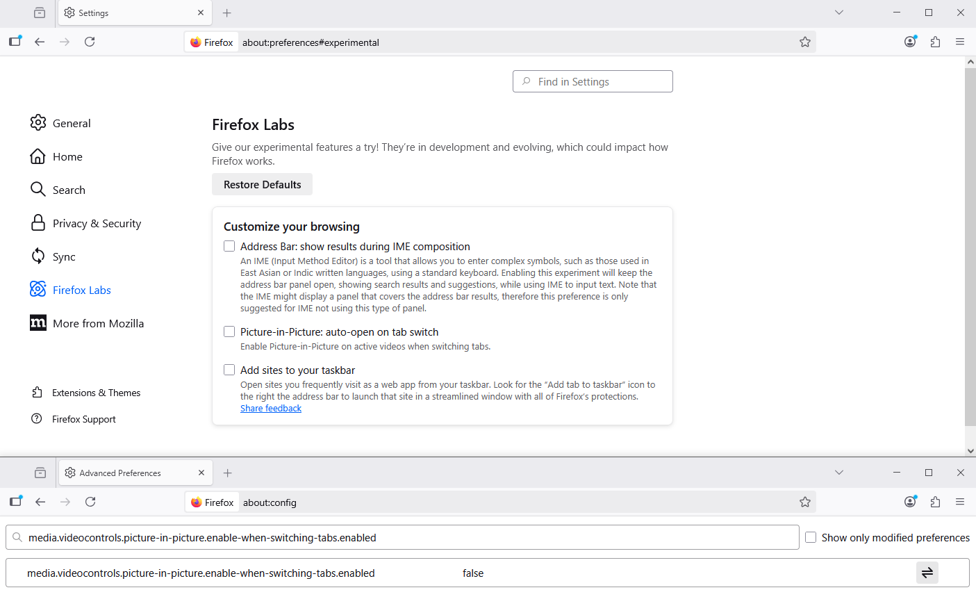 Firefox Labs Picture-in-Picture: auto-open on tab switch Enable Picture-in-Picture on active videos when switching tabs.