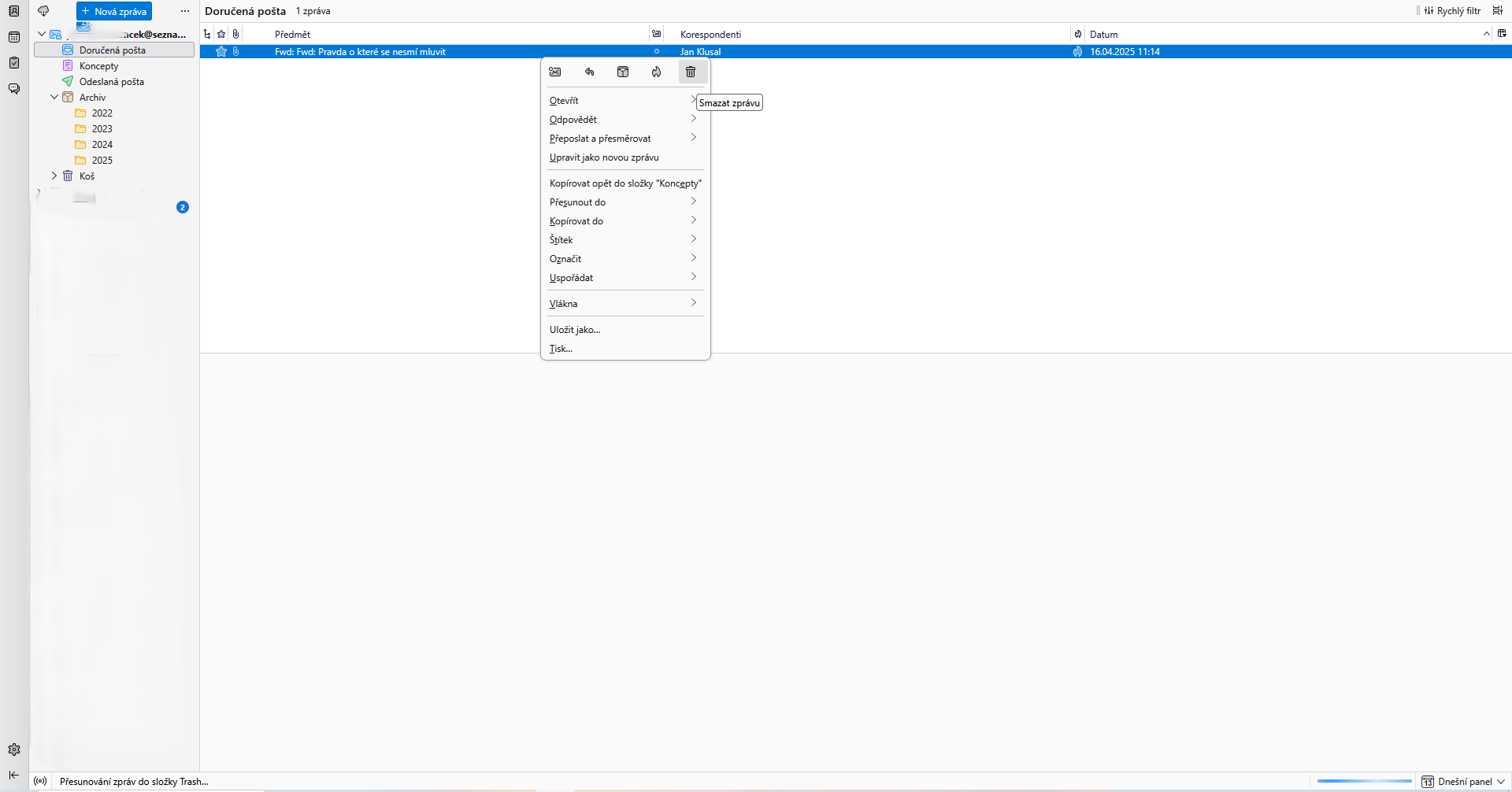 Dobrý den. Promazával jsem zprávy a jednu zprávu se nedaří smazat.Prošel jsem různé řešení ale nedaří se. Když na zprávu kliknu tak normálně se zobrazí možnosti archivovat,přeposlat,smazat atd. Zde je jen modrý řádek a žádná možnost co s tím udělat. Když na řádek kliknu pavým tl. tak se sice objeví možnosti včetně koš ale pokud dám koš tak dole na spodním řádku běží přesouvání zpráv do složky Trash... ale nic se neděje.Jak to vymazat?Mám to na 3 pc a všude se to chová stejně.Chtěl jsem samotný mail vymazat ale nevím kde ho hledat.