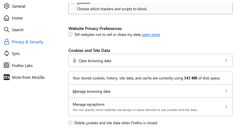 The most recent Firefox update (145.0) lacks the convenience of easily editing the cookie collection that tells websites about me. The feature I'm referring to was under settings - privacy and security - and then something about cookies. It allowed me to show what sites had collected cookies on me recently and to erase any private data they had collected.
