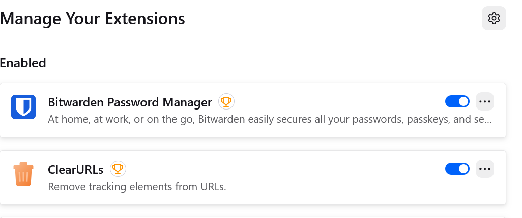 The boxes that open after right-clicking on the gear or puzzle icons do not match what the multiple online help suggestions show (I cannot take a screenshot of what I see in my drop down menus). I have deleted and reinstalled Instapaper and Bitwarden to no avail. Multiple suggestions from Bitwarden emails did not work and they suggested that it may be a Firefox issue.