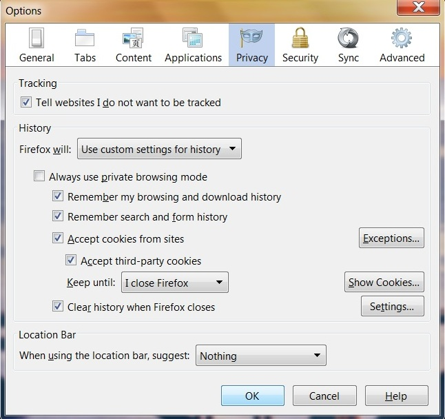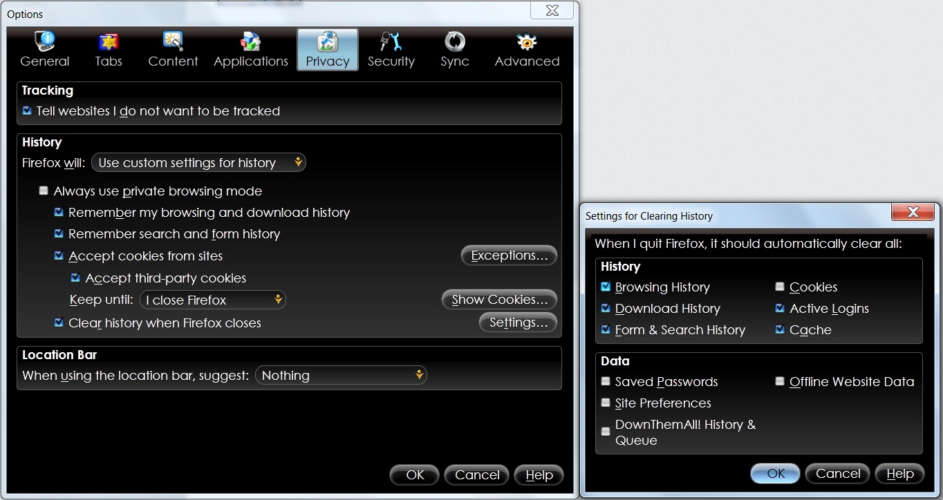 In the sub-menu "Settings" under the Clear History when FF closes: All 6 boxes are checked for History and no boxes were checked for Data (all the defaults)