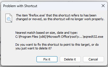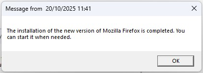 I have just started a new job and installed the Firefox browser on my PC (W11) as part of setting up my new workstation. The application works fine until I get a message that Firefox needs to install an update, 'please close it or it will close automatically in one hour'. After the update I get a message that the update is complete and you can restart the application, but the application no longer works; the icon on the application list no longer works 'The item firefox.exe that this shortcut refers to has been changed or moved'. After re-installing Firefox it works OK again, but the process repeats. Although I have managed to succesfully update a new installation on two occasions, after a few days the process repeats and I need to re-install again.