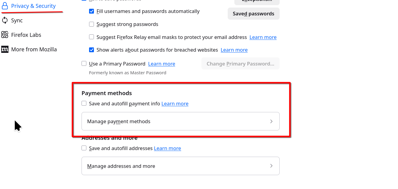 Missing edit payment methods button within the privacy and security section of settings