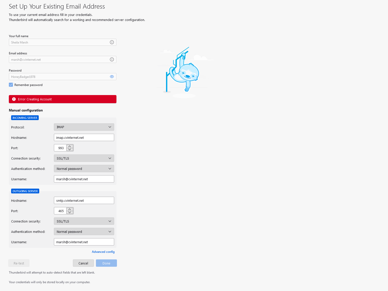 I am trying to set up the latest version on Thunderbird on my wife's old Gateway (WIN 7 home premium). The previous version of TB has problems so I deleted it and am starting over. I have manually configured this TB with the server info from the TB accounts on our other computers, but get the error as stated above. What do I need to check?