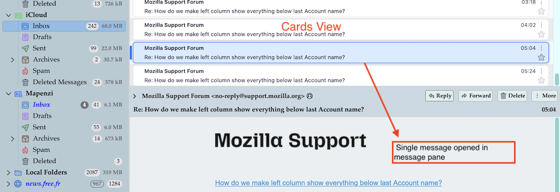 This is an example for Cards view with a single message selected (image). Are you asking how to display the contents of a single message? it's the same as in Table view: if your message pane is activated the message contents will be displayed in message pane. If the message pane is hidden message contents will be displayed via double-click in a new tab or a new window