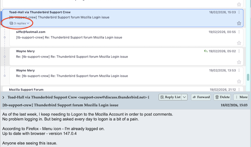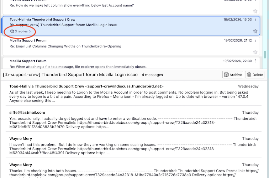Clicking the later, the "3 replies>" will show the messages belonging to the thread. Now each message is available.