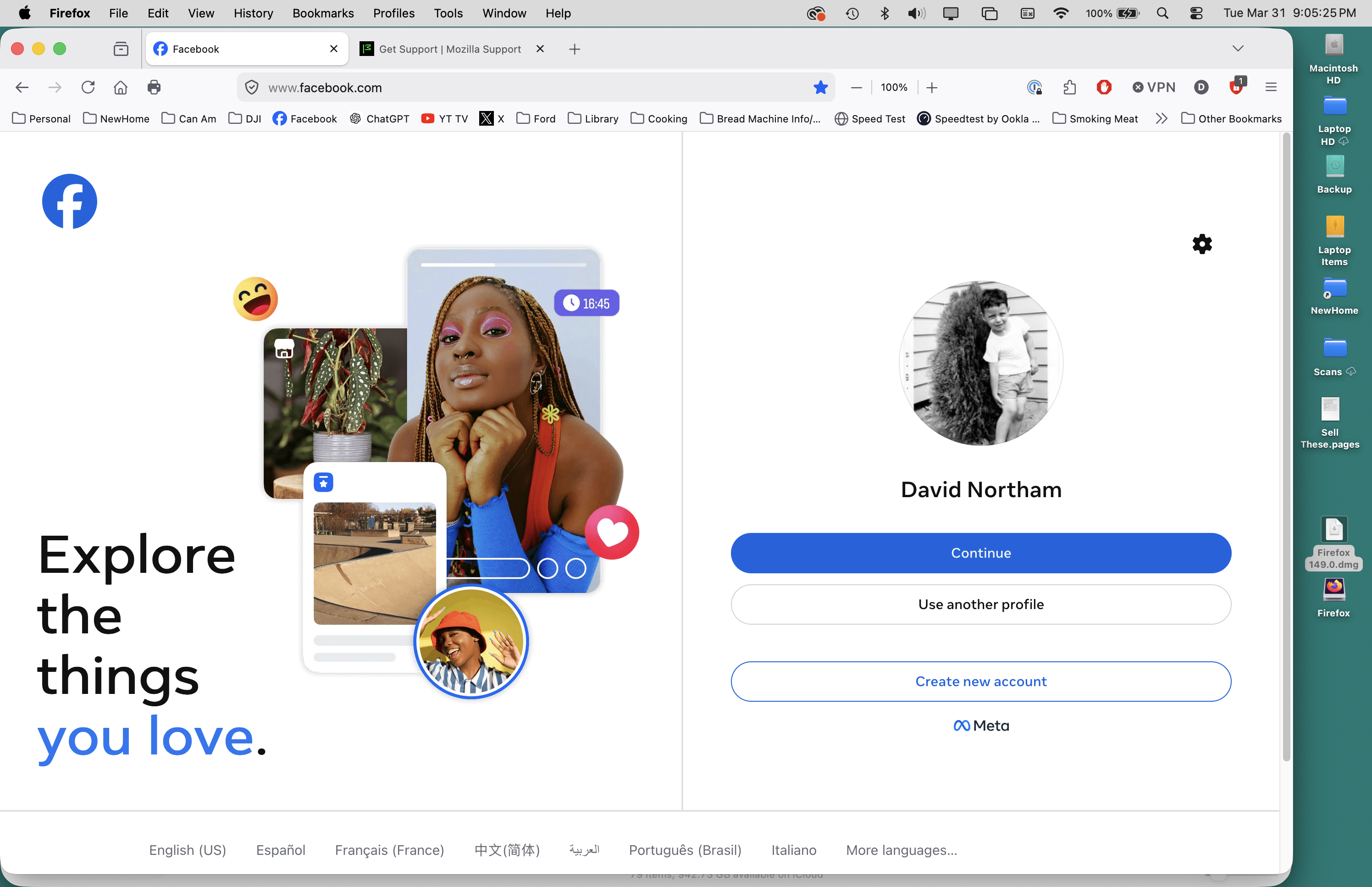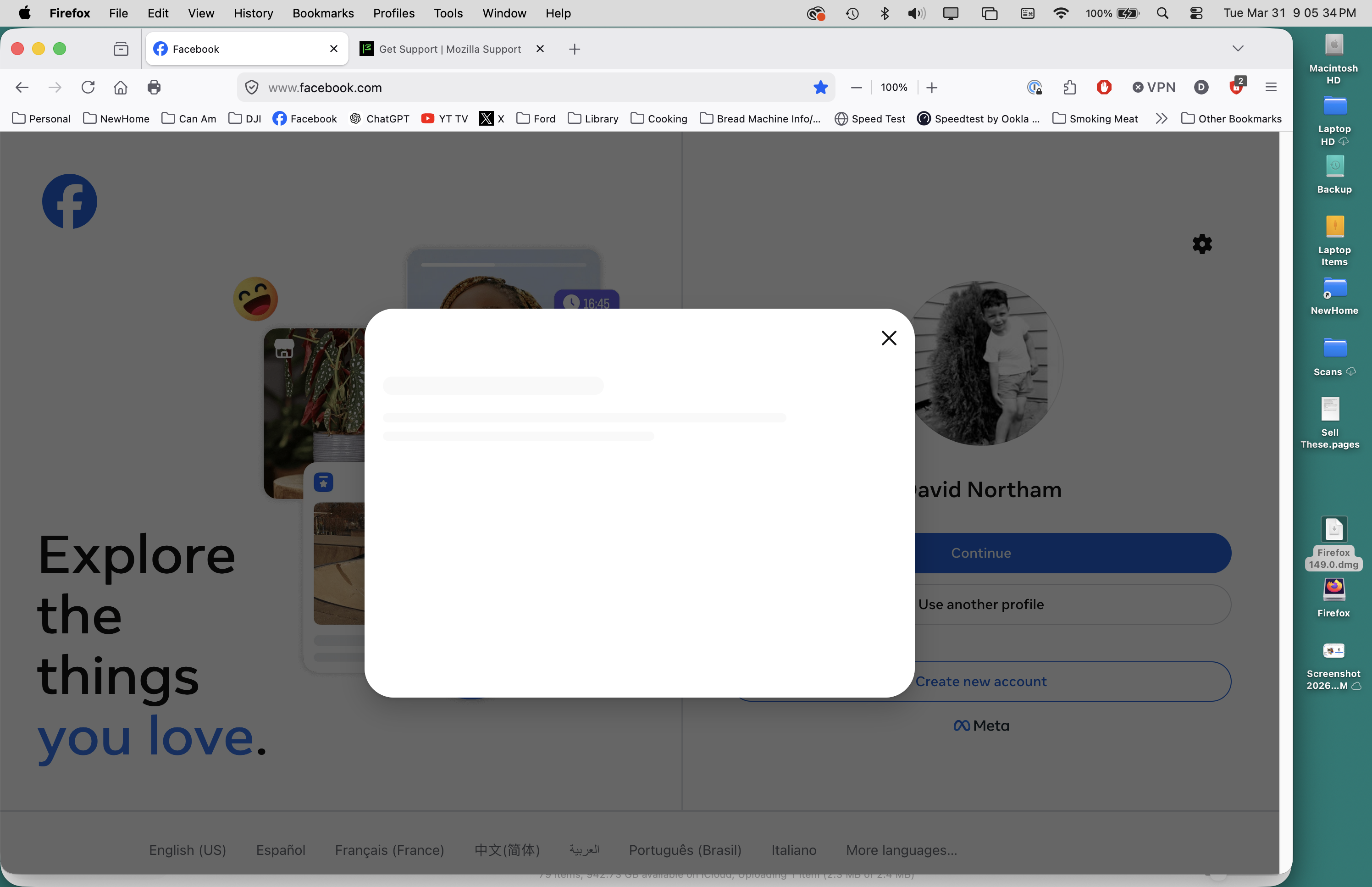 I have been logging into Facebook forever. Suddenly today I get to the login page, click on continue and I get the white dialog box but no fields to enter my login data. I don't know if Mozilla did an update or not and broke that feature. It is the only thing I can think of that would cause the issue.
