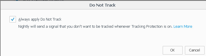 Also, in Nightly version, the "Do Not Track" preference is active by default (if you click the "manage your Do Not Track settings", see the other screenshot (Always apply do not track).