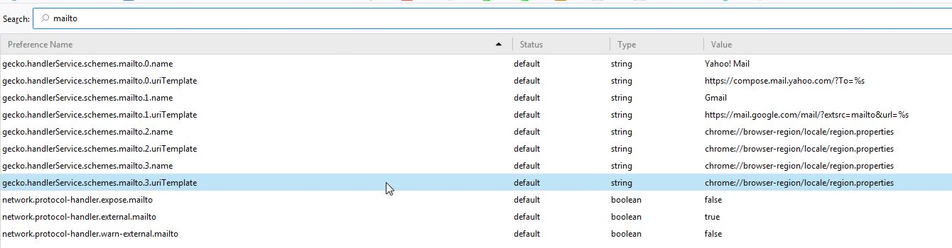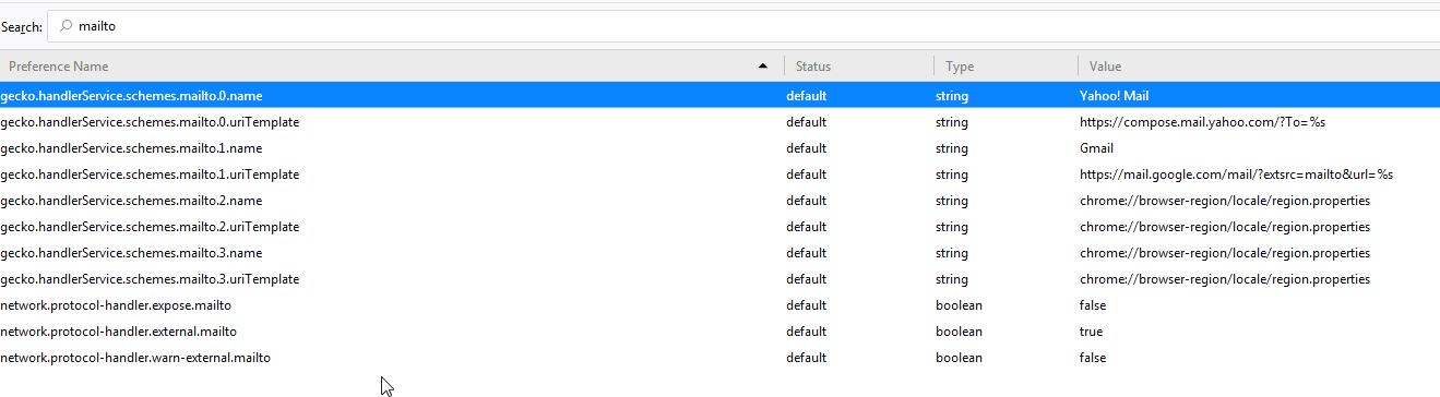 You can also check the mailto prefs on the about:config page and make sure they are default and not user set (bold). You can reset user set (bold) pref(s) on the about:config page via the right-click context menu to the default value. You can open the about:config page via the location/address bar. You can accept the warning and click "I accept the risk!" to continue.