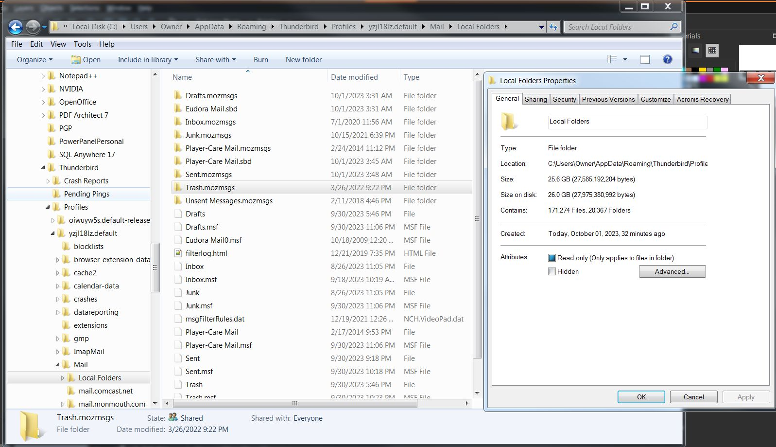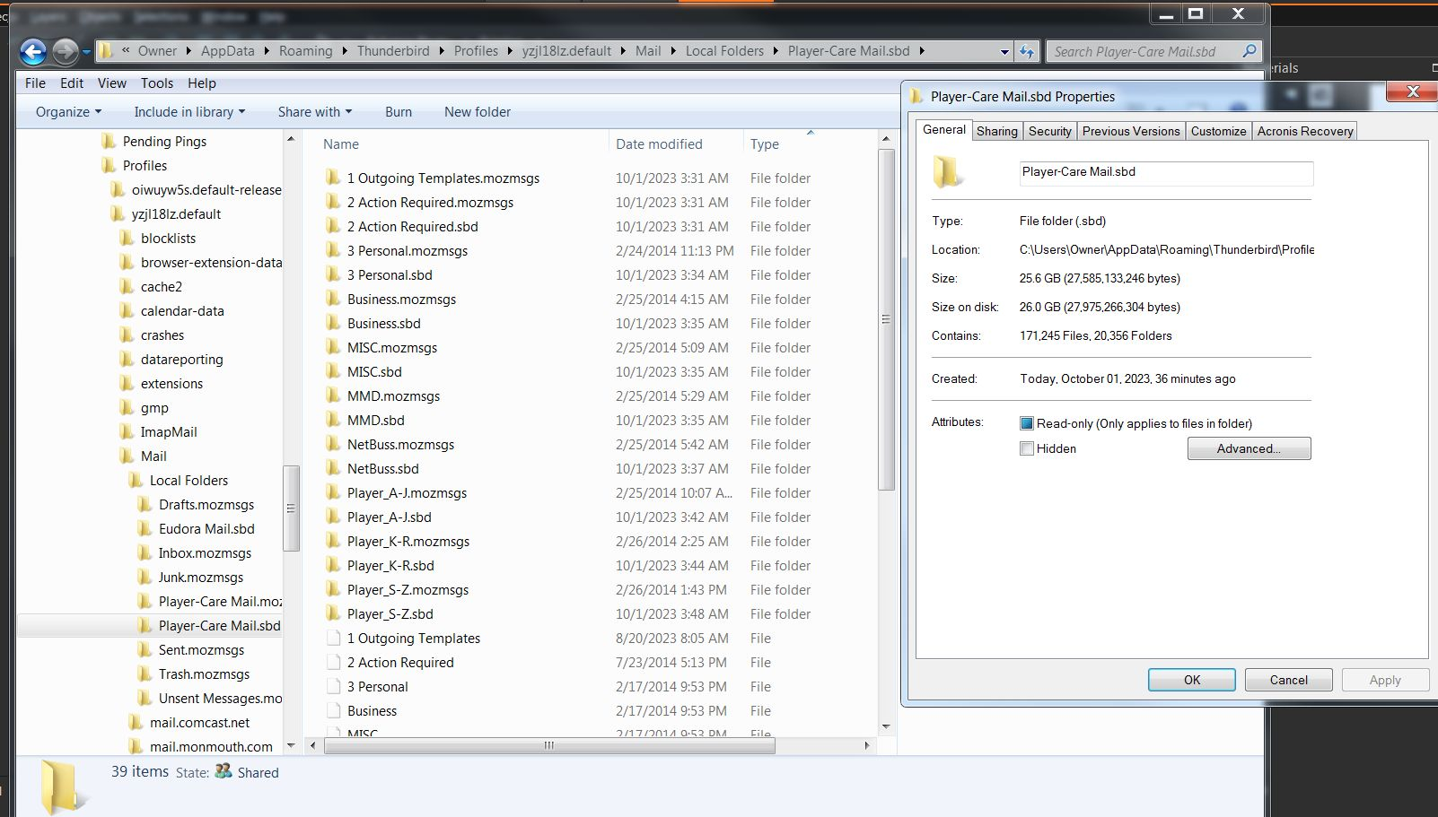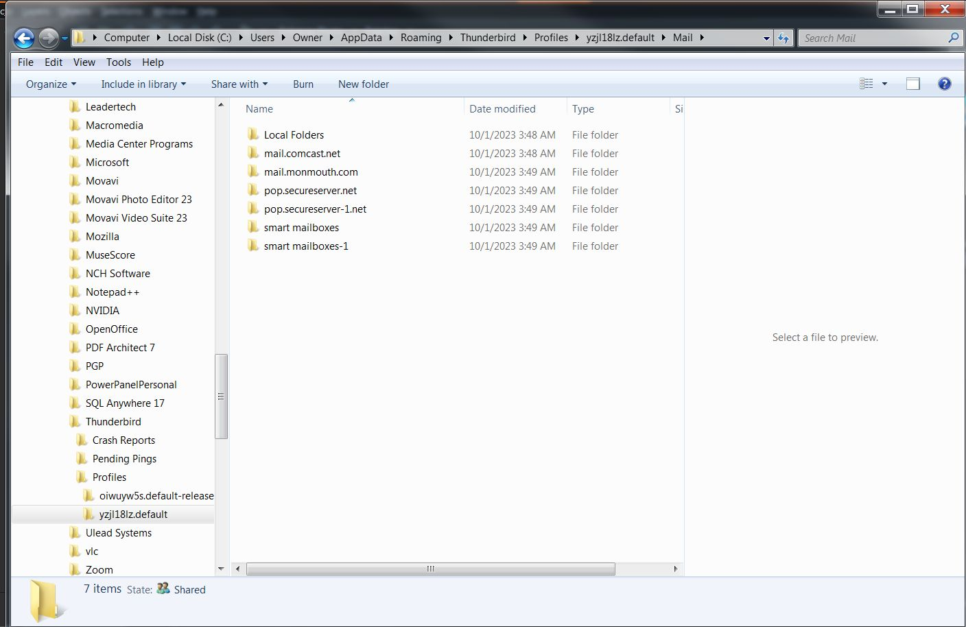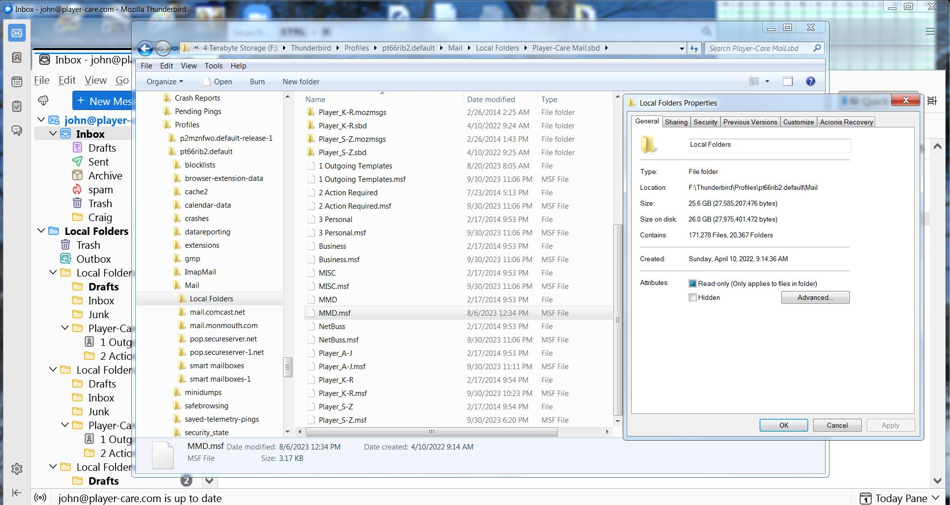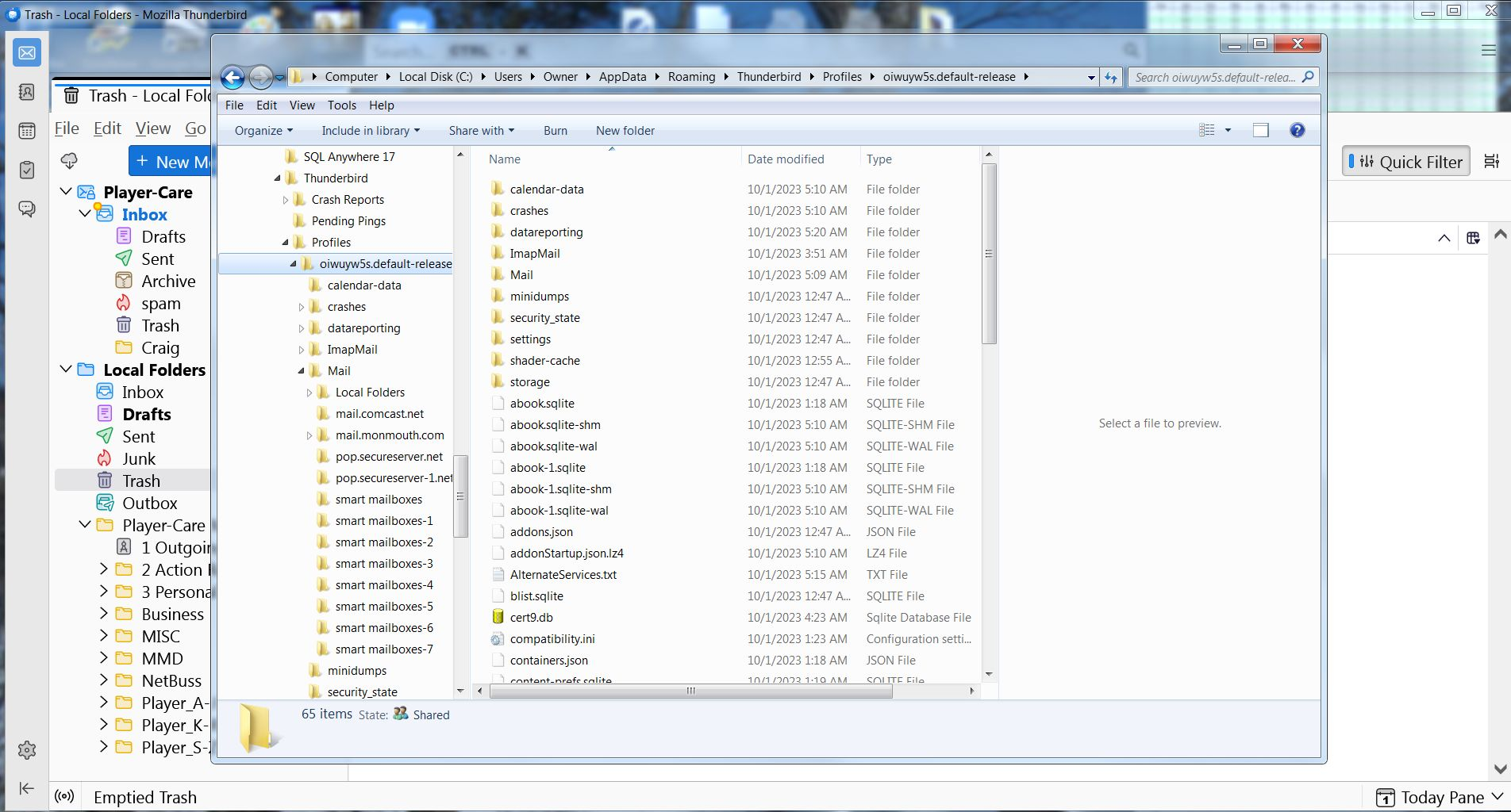 I solved the problem!!! In the screenshot, just below the ImapMail folder is the Mail folder. HOWEVER, that's not the way the directory looked ten minutes ago. Ten minutes ago, there was another Mail folder and it had the Local Folder under it. BUT, just below the Local Folder (in the tree) was the Mail folder you see in the screenshot. AND, it had all of my 20+ gigs of mail folders. So, I simply dragged that Mail folder to the 'oiwuy5s.default-release' folder. When I did that, the computer asked if I wanted to merge the files, and I said YES. Then when I opened Thunderbird again, all of my mail folders (over 9000) were there. (There was lots of other Local Folders and Imported folders, but I deleted all of them until all I had left were the right ones.