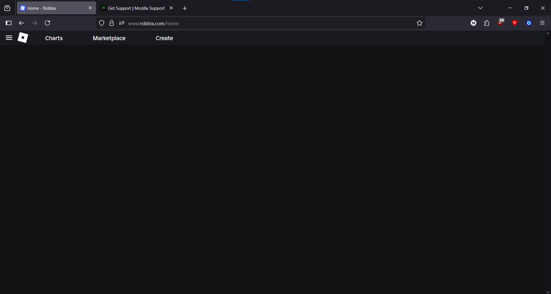 The issue is very simple. When loading into the roblox website, the page becomes almost completely empty aside from the buttons at the top like Charts, Marketplace and the roblox icon at the top left. All of which do nothing when pressed.
