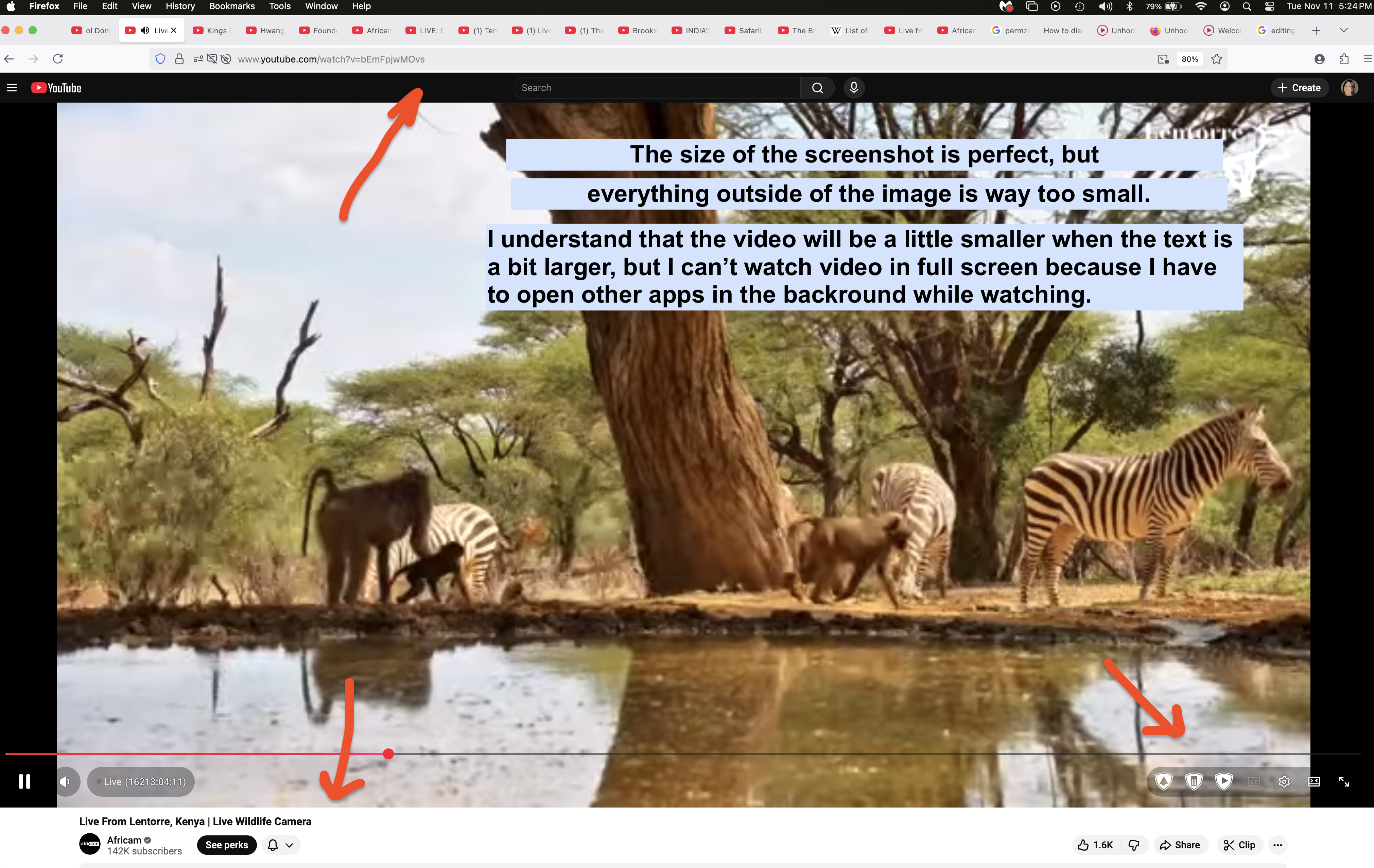 The "Subject" pretty much describes my specific question. You will see an example in the screenshot I uploaded. When I increase the screen using comm + the type is too large & the video shrinks. ((although, somehow, the screen becomes smaller even though I'm enlarging it). Even with my reading glasses, I can't see 95% of the type.
