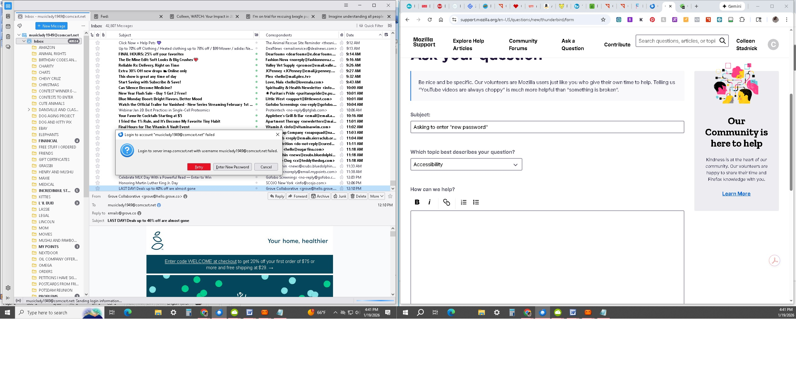 I'm being asked to login, retry, enter new password or cancel so can't access any e-mail as of about noon today, 01/19. Screenshot attached. Thanks.