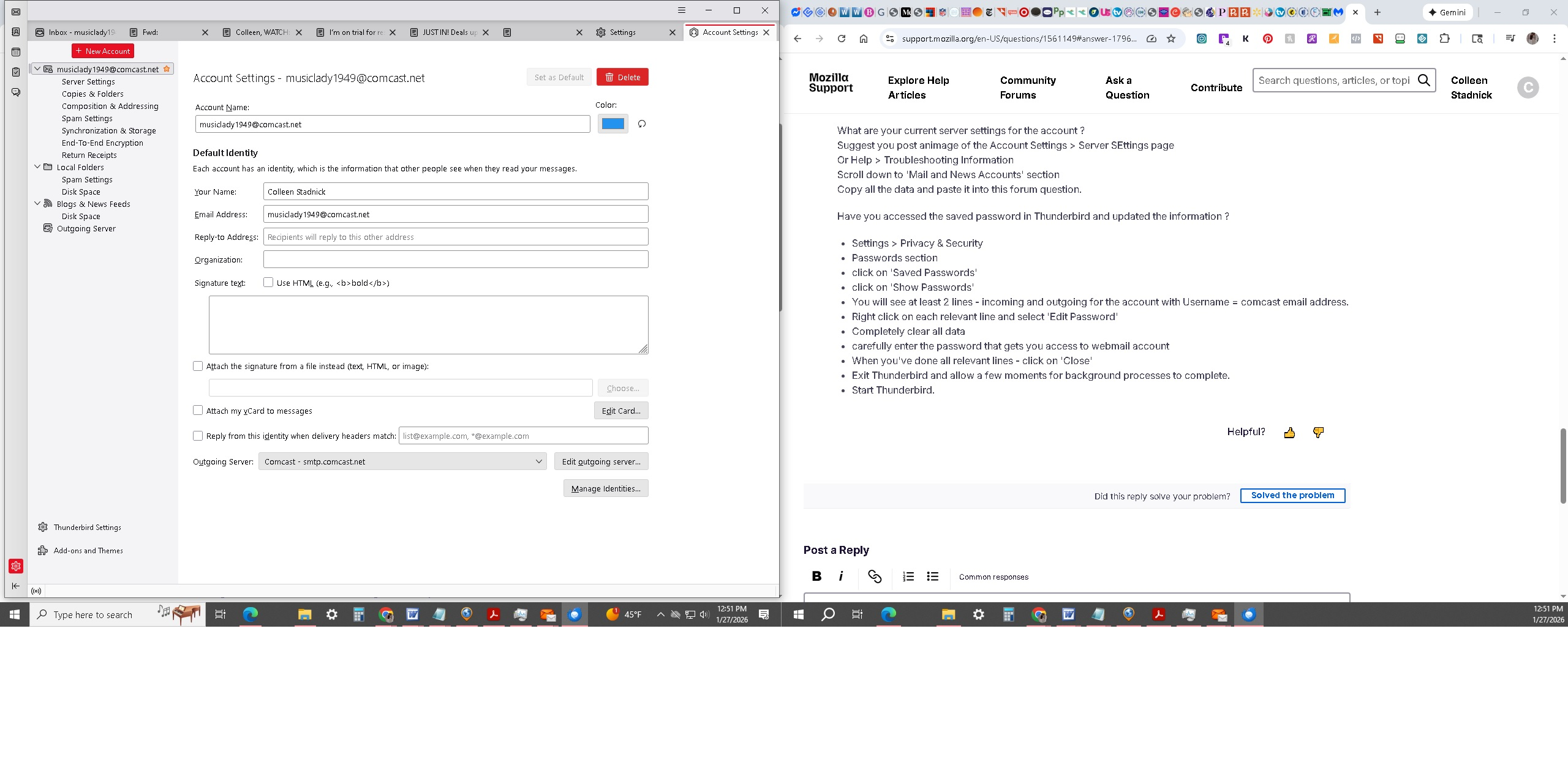 I did all of this: Settings > Privacy & Security Passwords section click on 'Saved Passwords' click on 'Show Passwords' You will see at least 2 lines - incoming and outgoing for the account with Username = comcast email address. Right click on each relevant line and select 'Edit Password' Completely clear all data carefully enter the password that gets you access to webmail account When you've done all relevant lines - click on 'Close' Exit Thunderbird and allow a few moments for background processes to complete. Start Thunderbird. It didn't work.