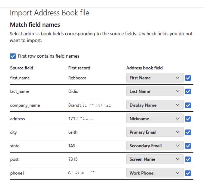 I set the headings the same as in the Thunderbird exported file. Didn't work. It only brought in last names this time.