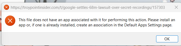 Sorry if this is already a problem mentioned but can't find it so here we go. If I receive an email with a link or several links and I click on them I get this noisy message saying there is no app associated with this link. This just started a couple of days ago. I didn't do anything different that I know of. Perhaps this is just a new problem with that awful OS W11.