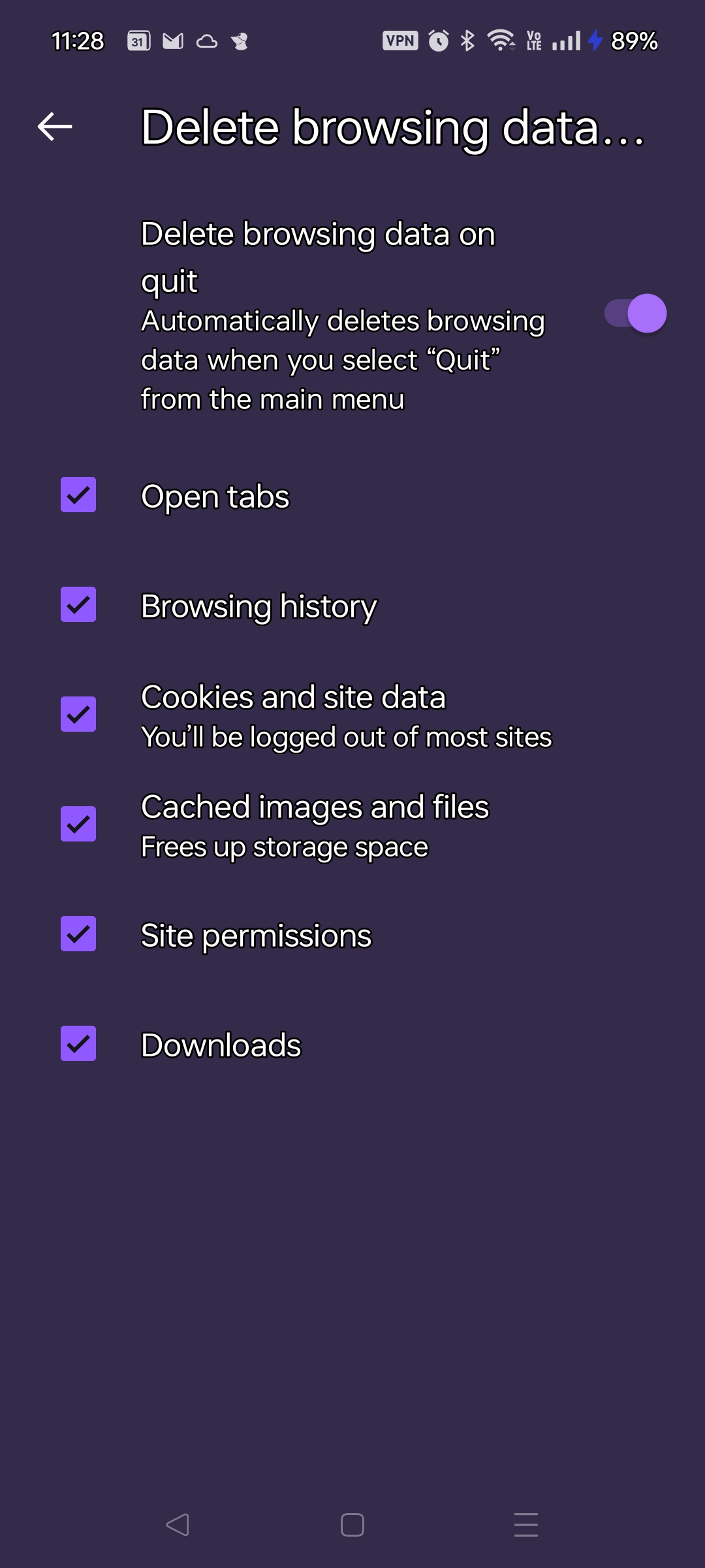 I have it set to always e in private browsing and to always clear everything on exit. I am definitely hitting "quit" from the menu to close the app, not just swiping it away. When I reopen it, I am still logged in to everything and nothing is cleared.
