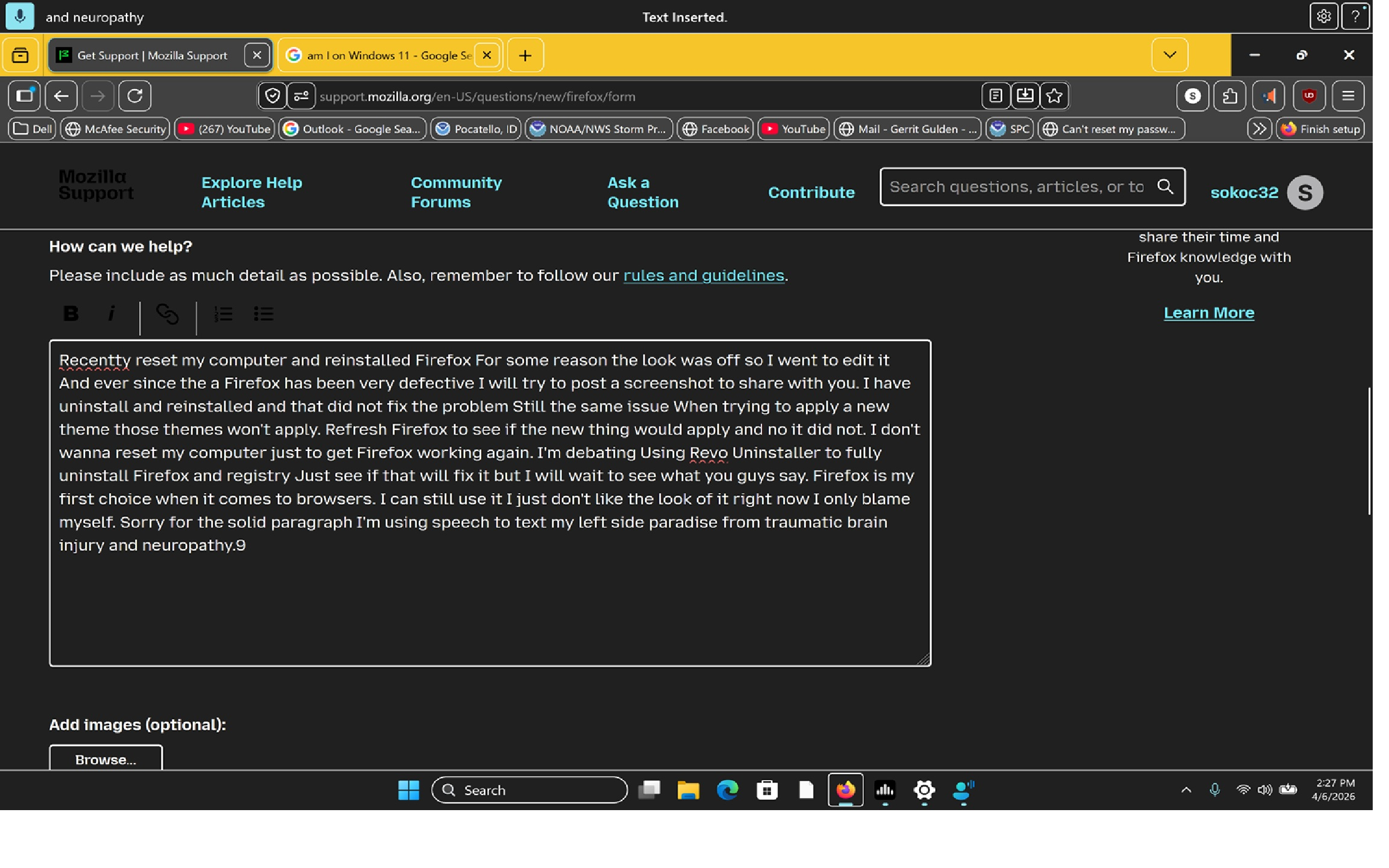 Recentty reset my computer and reinstalled Firefox For some reason the look was off so I went to edit it And ever since the a Firefox has been very defective I will try to post a screenshot to share with you. I have uninstall and reinstalled and that did not fix the problem Still the same issue When trying to apply a new theme those themes won't apply. Refresh Firefox to see if the new thing would apply and no it did not. I don't wanna reset my computer just to get Firefox working again. I'm debating Using Revo Uninstaller to fully uninstall Firefox and registry Just see if that will fix it but I will wait to see what you guys say. Firefox is my first choice when it comes to browsers. I can still use it I just don't like the look of it right now I only blame myself. Sorry for the solid paragraph I'm using speech to text my left side paradise from traumatic brain injury and neuropathy.