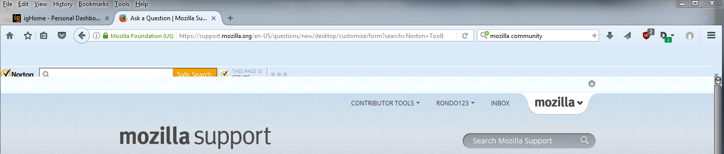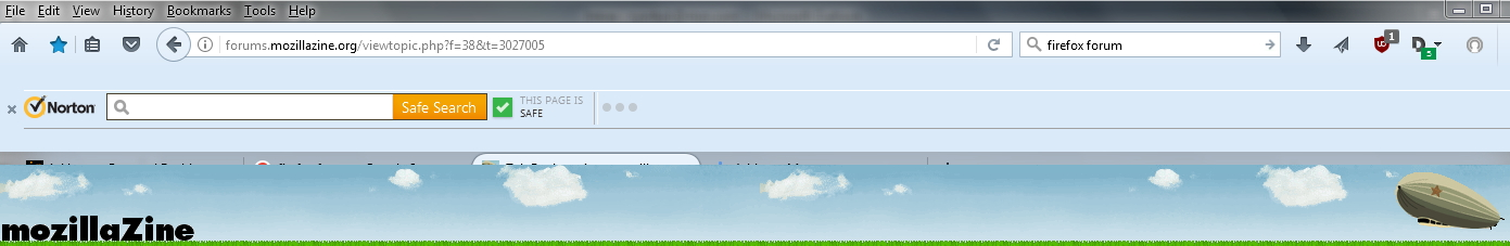 It's not just the Norton Toolbar. When I use Tabs on Bottom extension, which had been working fine until suddenly yesterday, where the Tabs toolbar was 75% covered by main window. Tried all kinds of combinations on and off between Norton toolbar and Tabs on bottom with no luck. This screenshot shows Tabs on bottom view-