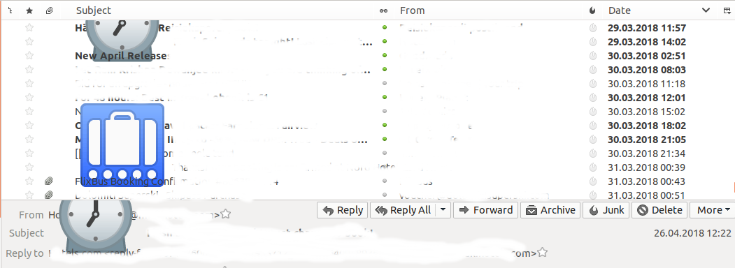 When I scroll my list of emails up and down (by mouse scroll button, there doesn't seem to be a possibility to scroll any other way) images appear on the screen as shown on the screenshot. If I scroll up and down again the same image appears in the same place. This started happening after I upgraded to Ubunu 18.04, TB version is 52.7.0